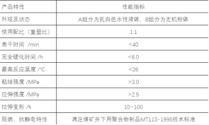 本产品由水性树脂溶液和无机粉体材料双组分包装组成,其中A组分由55%左右含水量的乳液和增稠剂组成,B组分由超细水泥、纳米硅灰、PP纤维等粉体组成。现场使用时按照重量比为1:1经专用的气动喷涂设备和专用喷枪施工。产品具有喷涂施工无回弹、无粉体污染、喷层硬化时间快、粘附力强、抗拉强度高、变形性优、安全阻燃抗静电、几乎无任何反应温度、应用安全性高等优异特点。可以依据井下巷道应用需要调配成不同颜色(白色、黑色、天蓝色)。